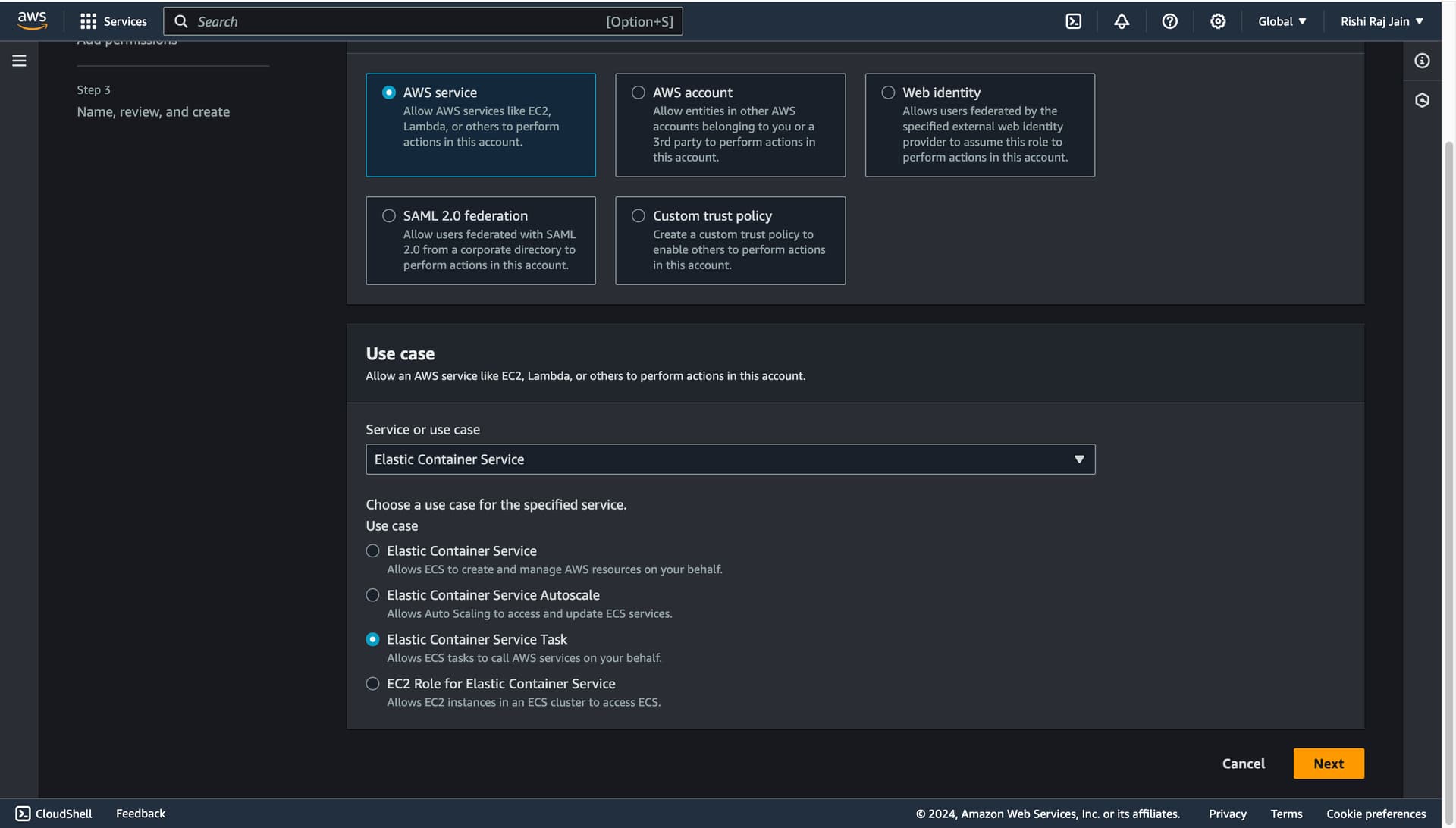 - In the navigation bar in your AWS account, choose your user name, and then choose Security credentials.